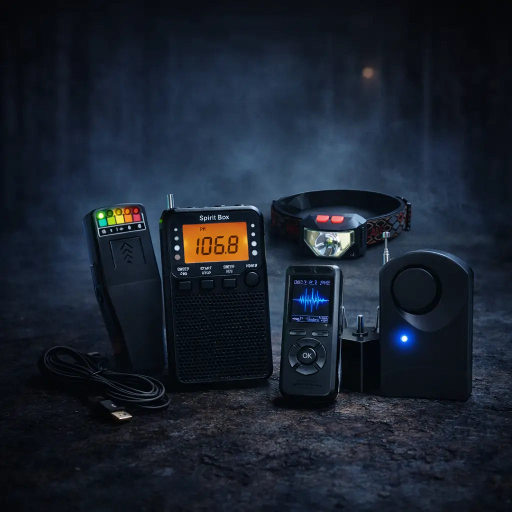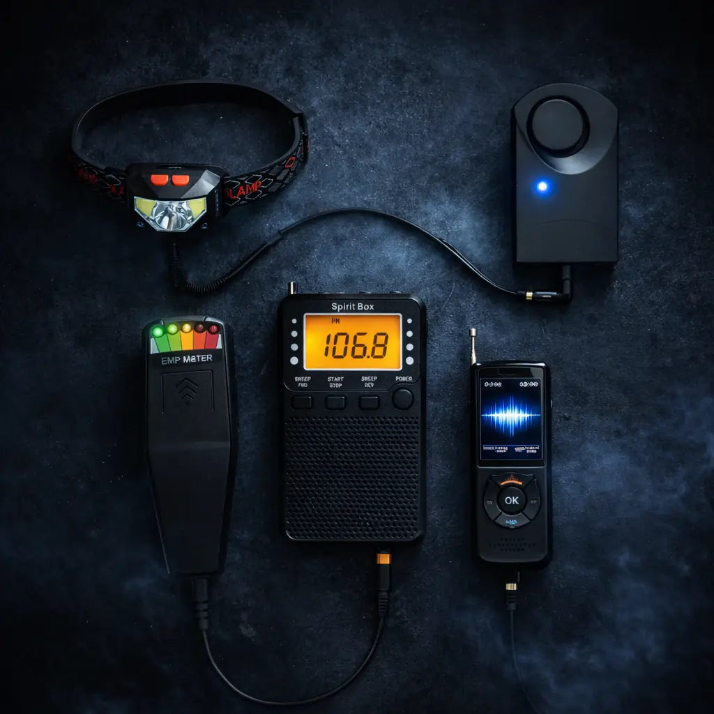 Spirit Box, EVP Recorder, REM Pod, 3 Motion Trigger Balls, and the necessary accessories.